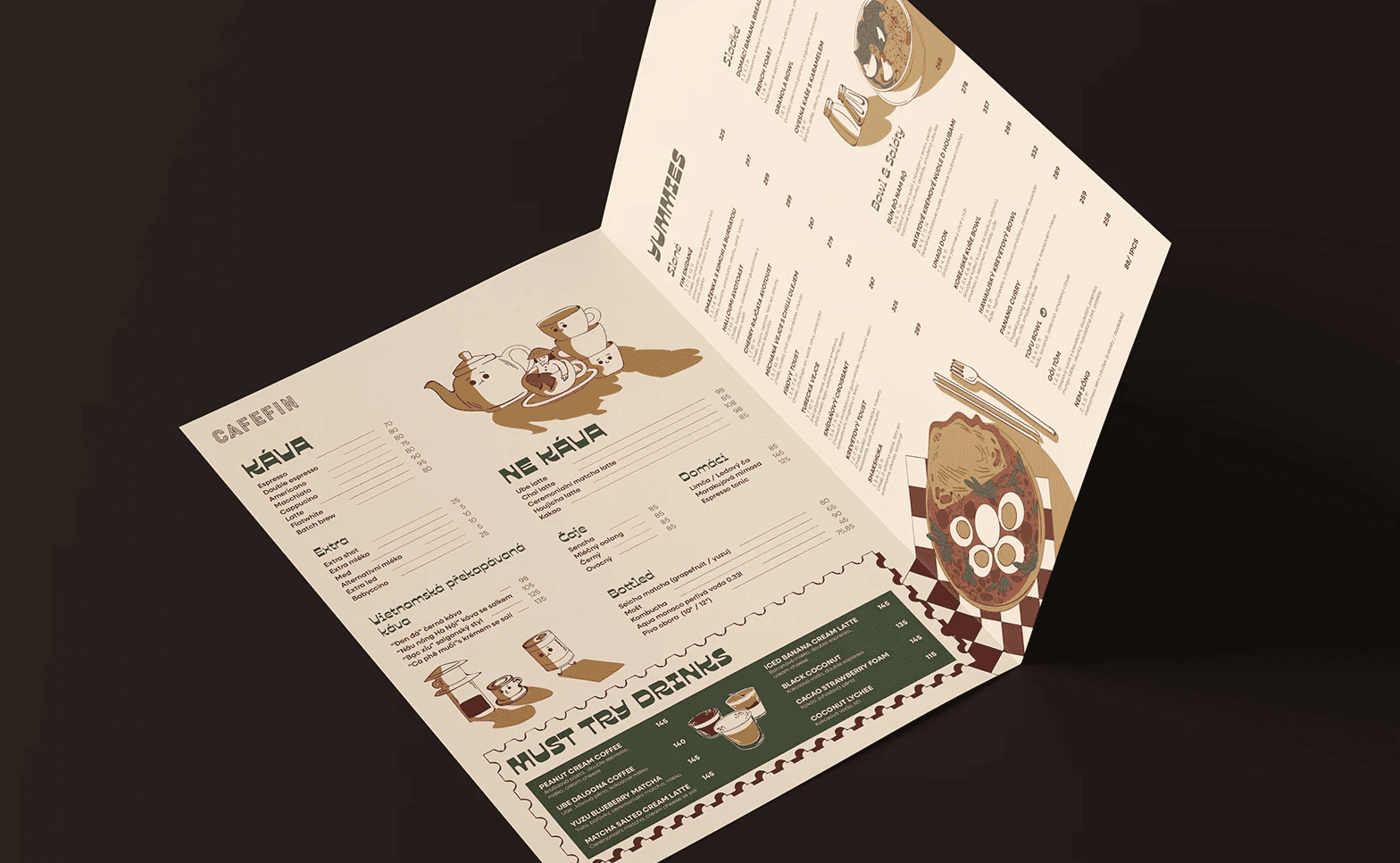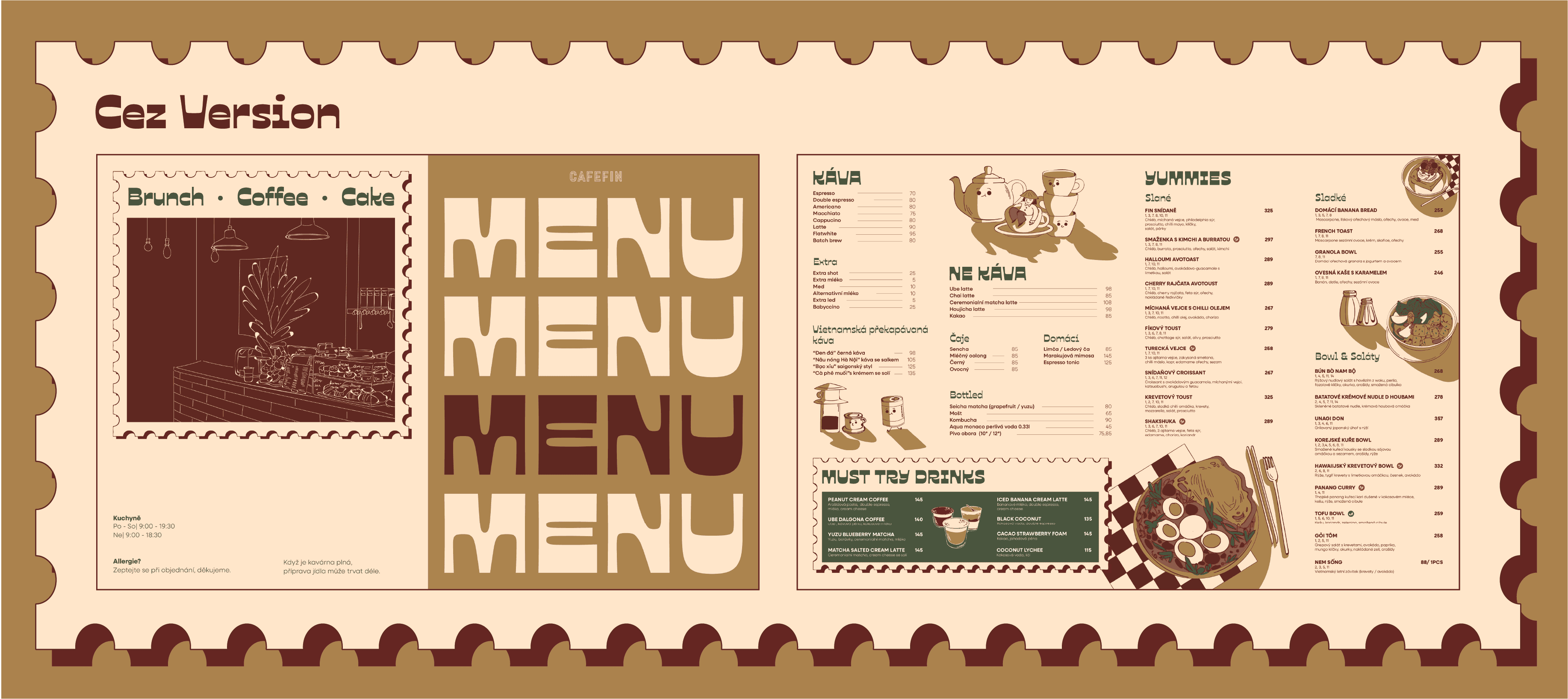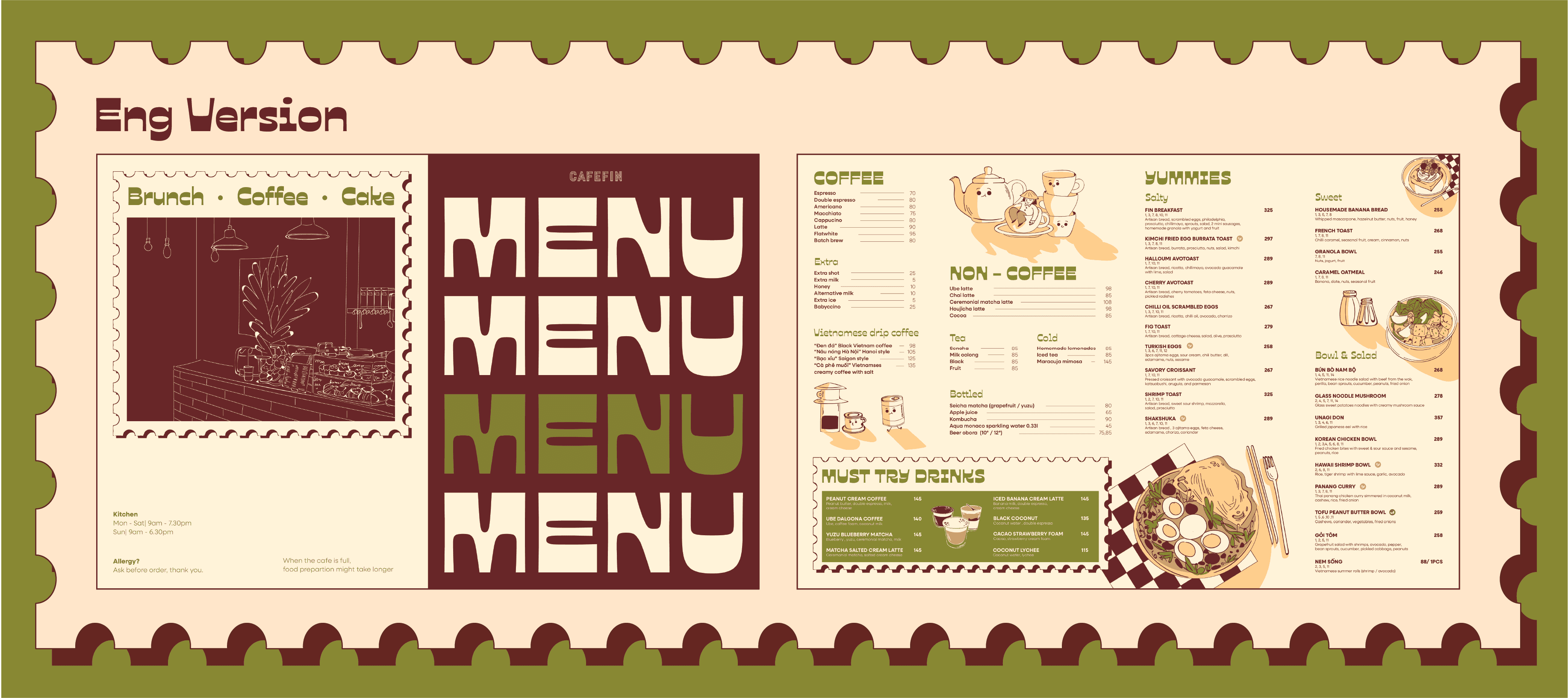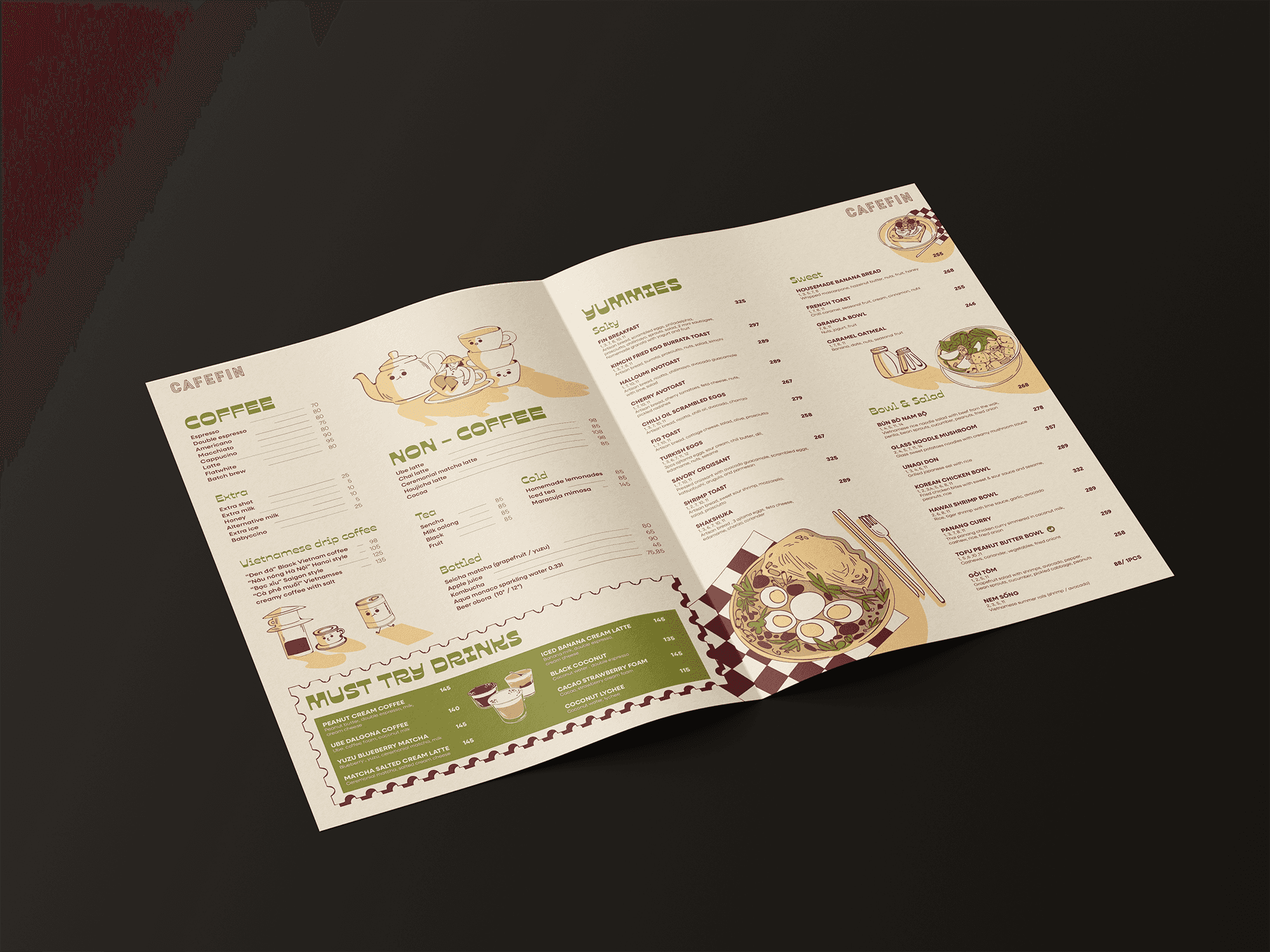 The menu design for CAFEFIN reflects the café’s cozy and welcoming spirit, blending warm tones with hand-drawn illustrations that celebrate Vietnamese culture. Playful yet refined, the layout invites customers to explore the fusion of East and West, echoing the charm and comfort of the café’s atmosphere. Every detail-from typography to texture, evokes a sense of home and tradition with a modern twist.