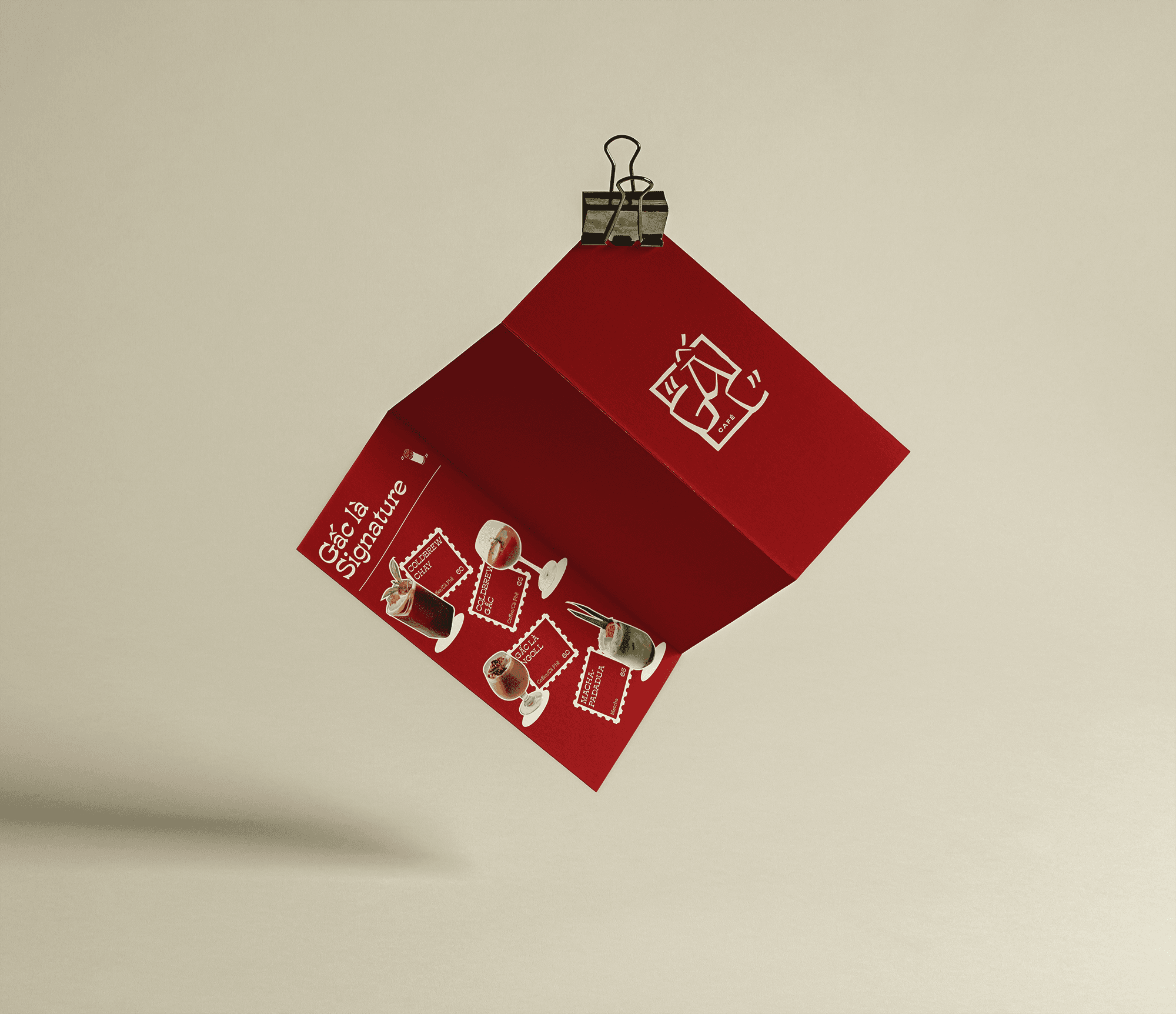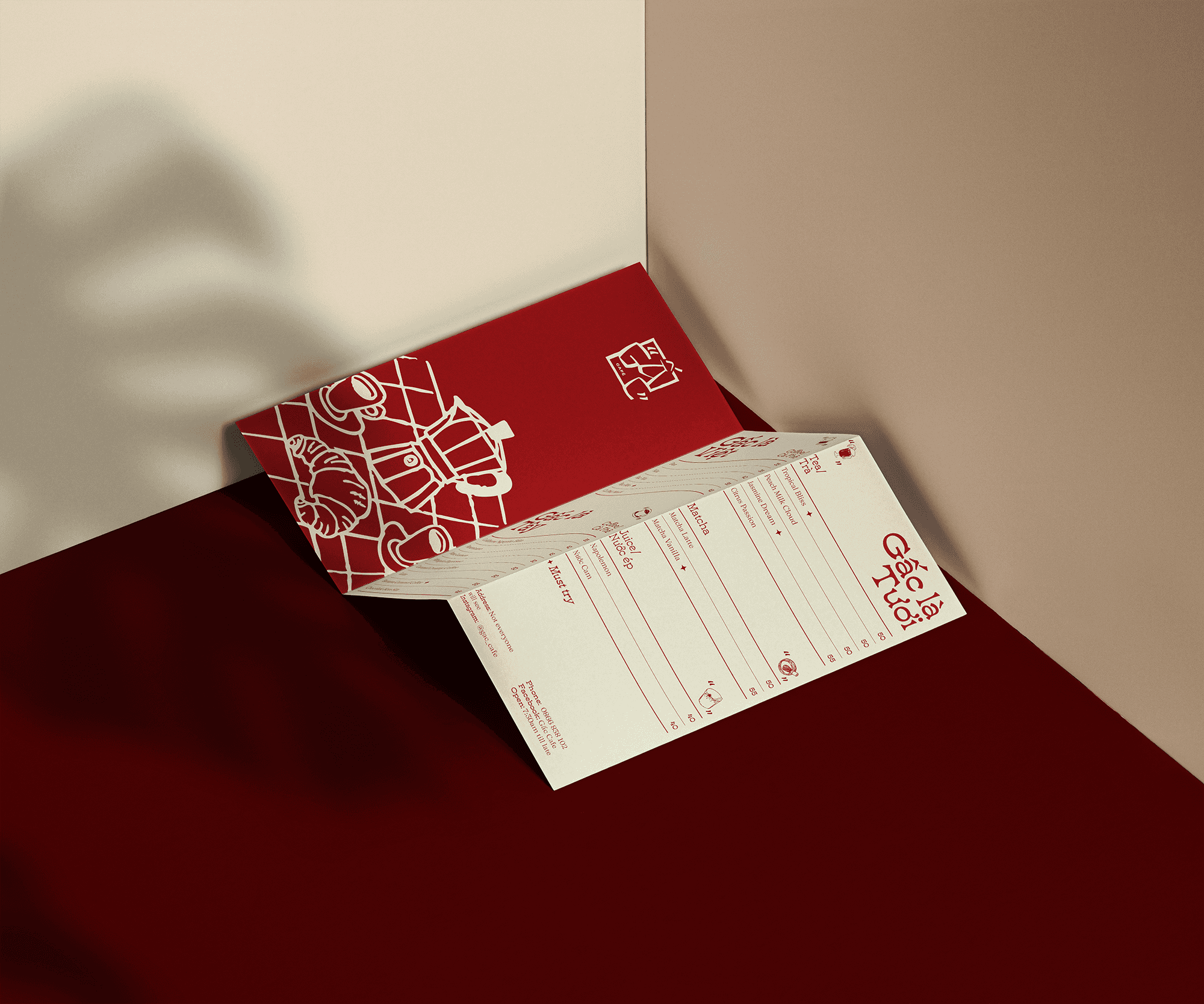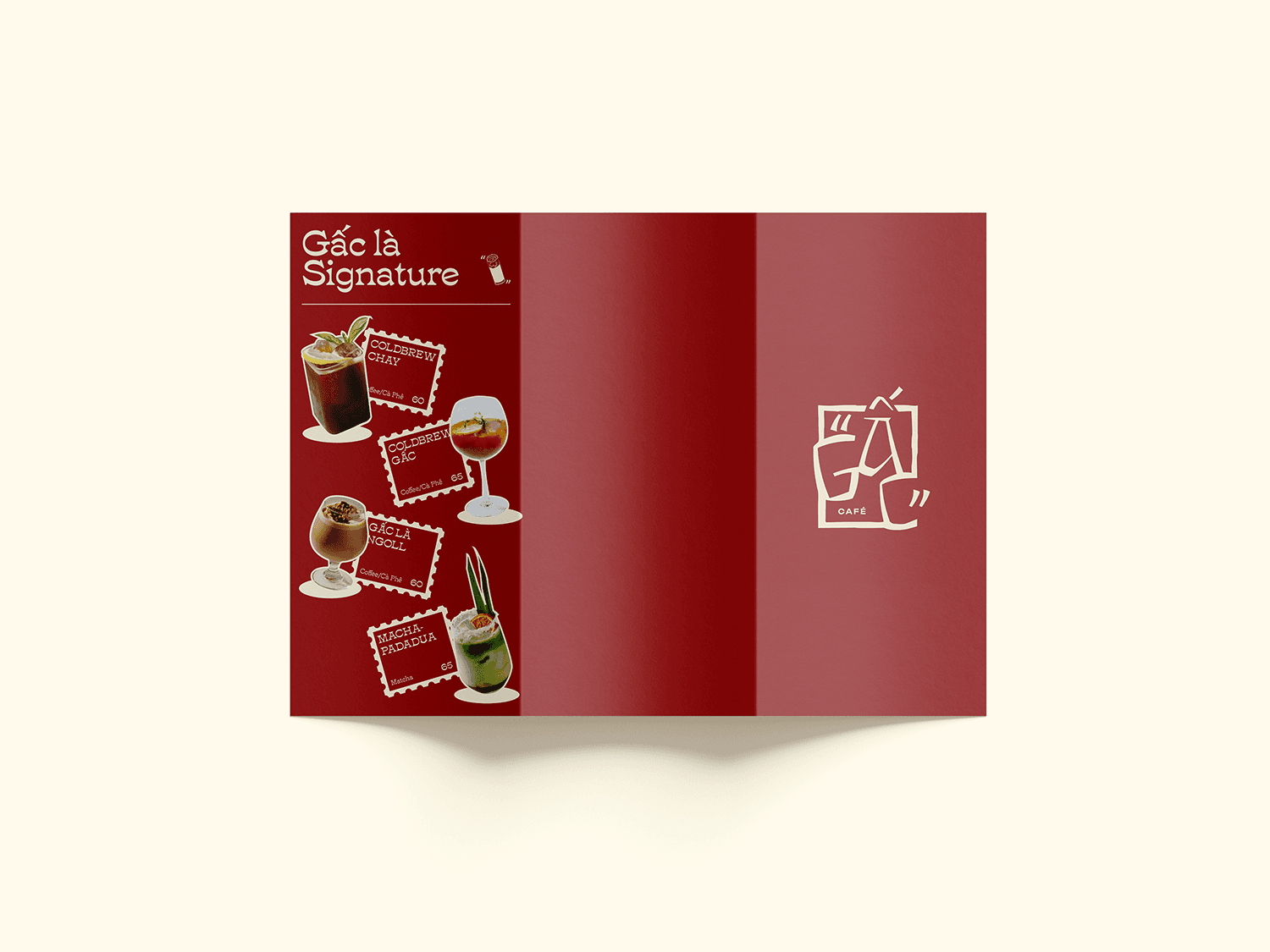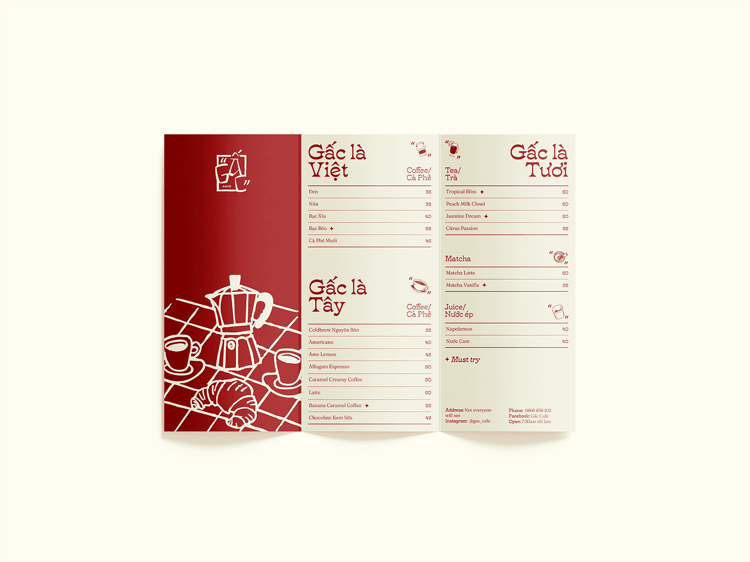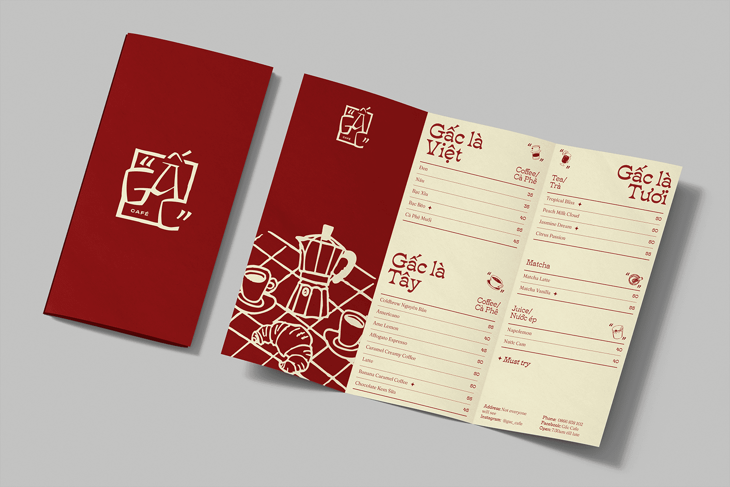 The menu design for "Gac" café combines funky flair with classic touches, using bold typography, simple layouts, and vintage ink illustrations. It feels approachable and friendly, inviting customers to explore the offerings with a sense of curiosity and comfort - just like the café itself.