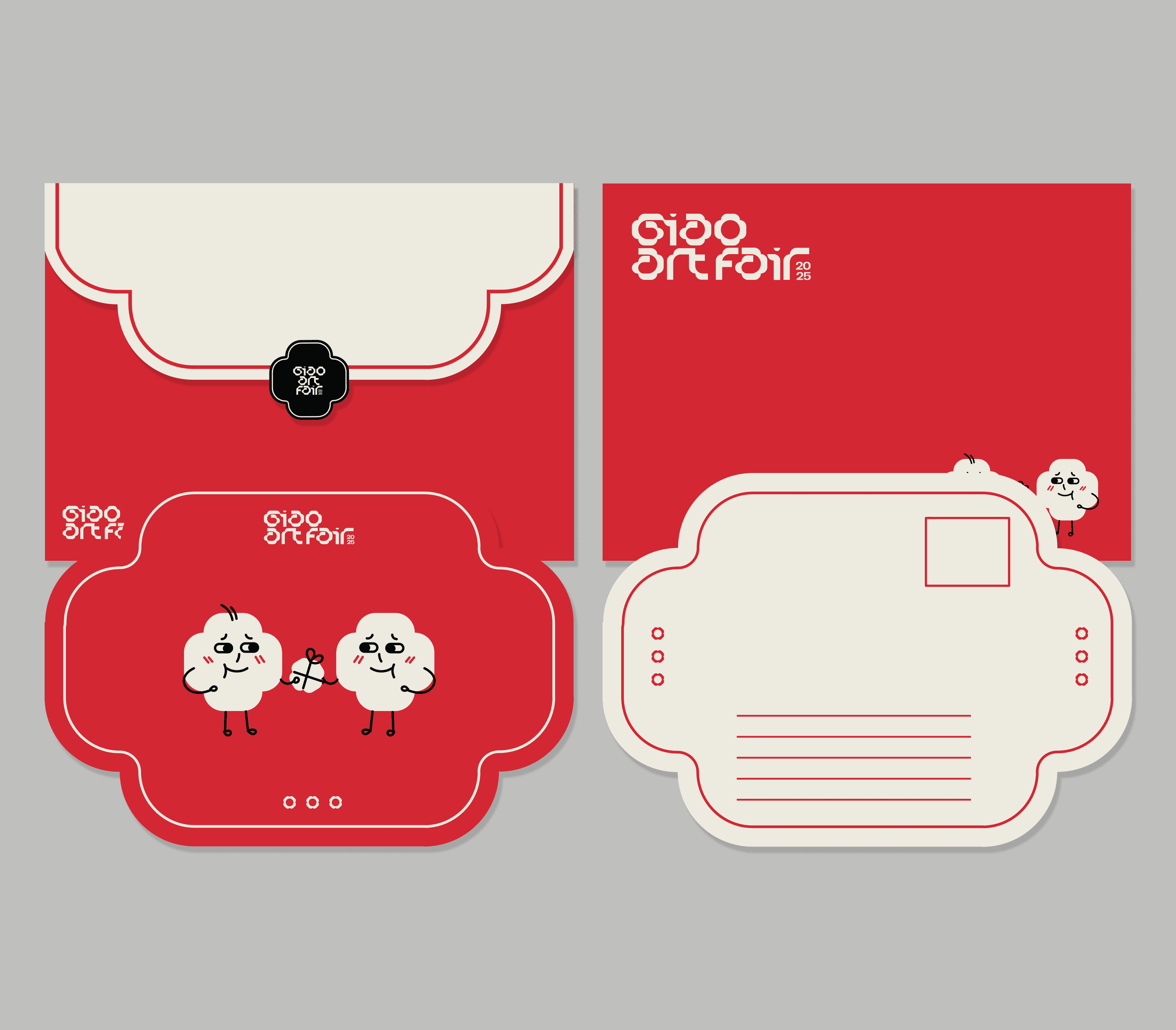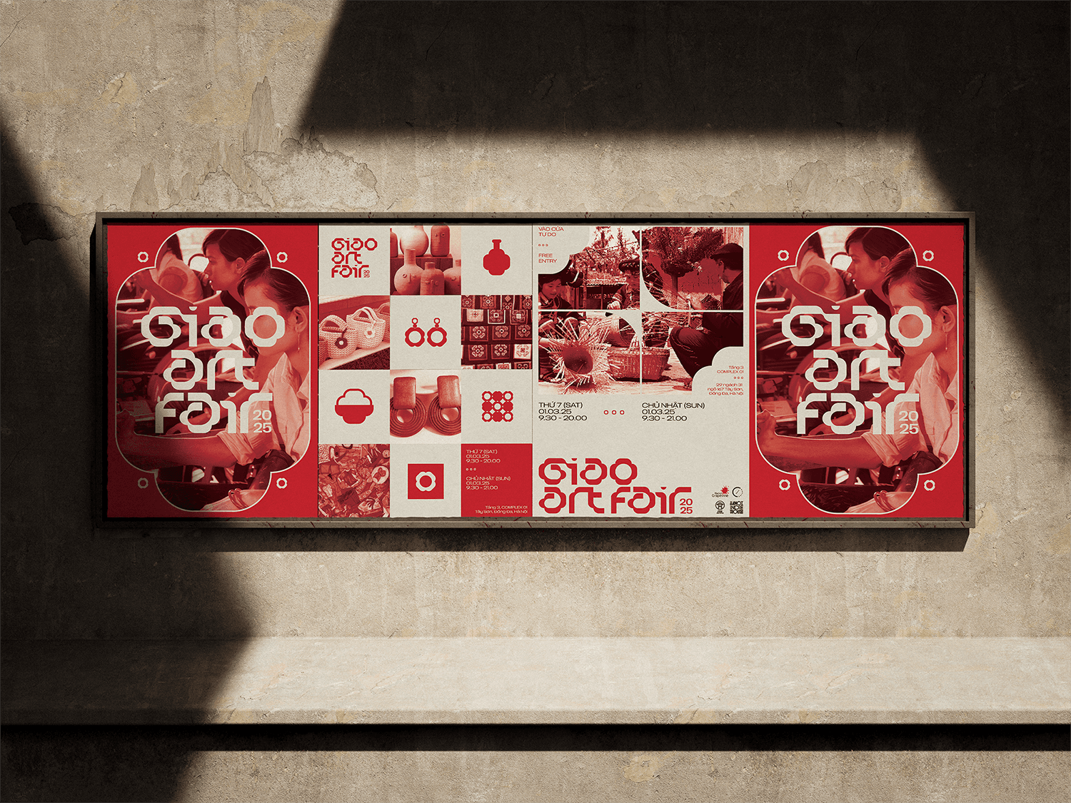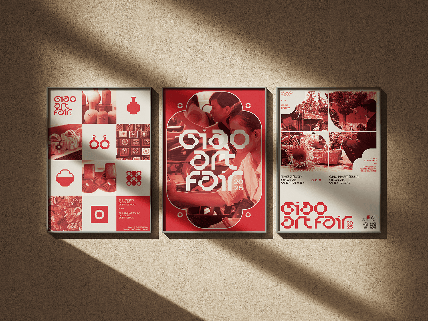 The identity and key visual for GIAO center around a four-petal flower logo, symbolizing connection, growth, and harmony. The warm beige and red color palette creates a welcoming, heartfelt atmosphere, while real photographs are integrated to evoke authenticity and closeness - reflecting the fair’s mission to connect people through art with real social impact.