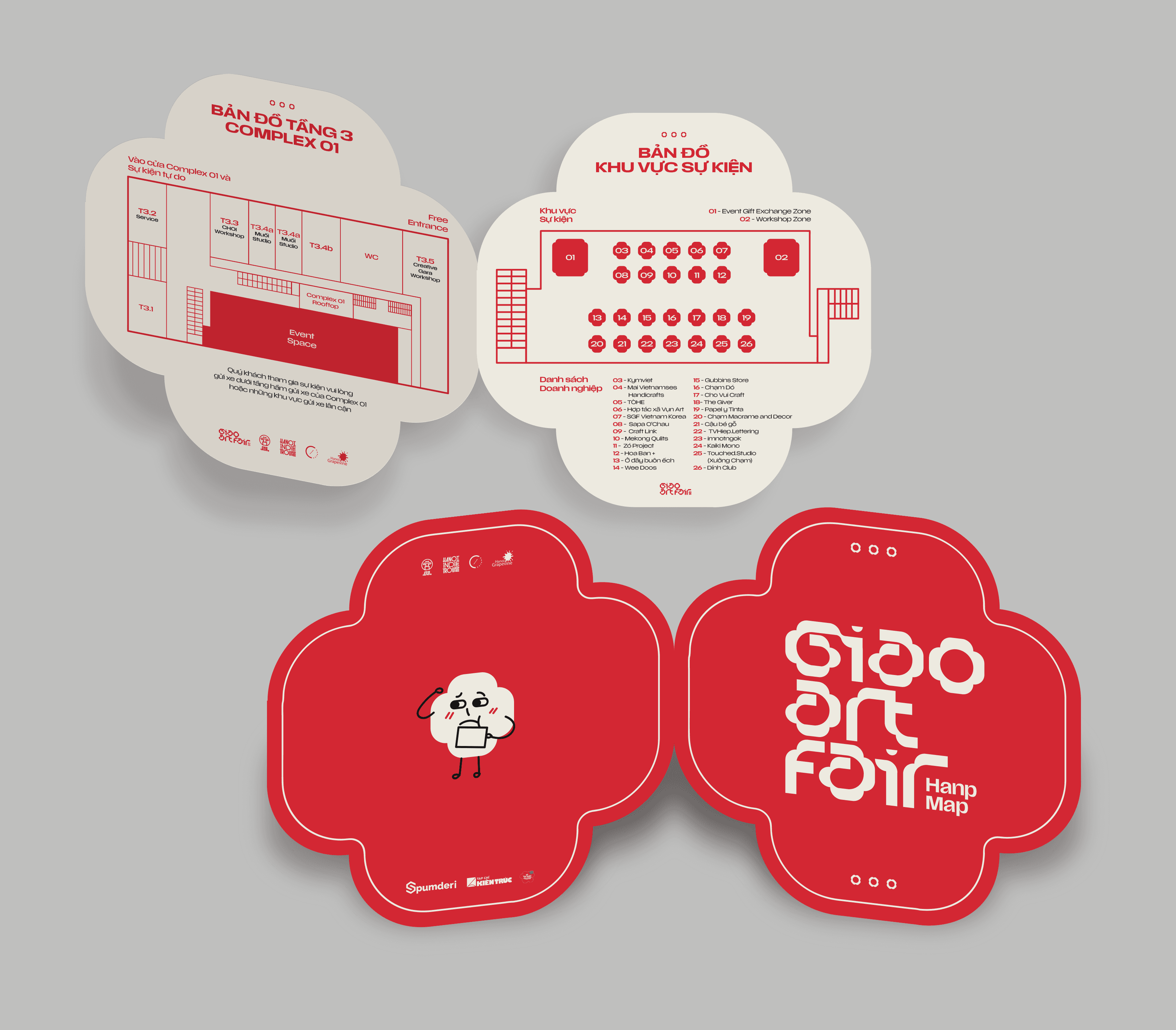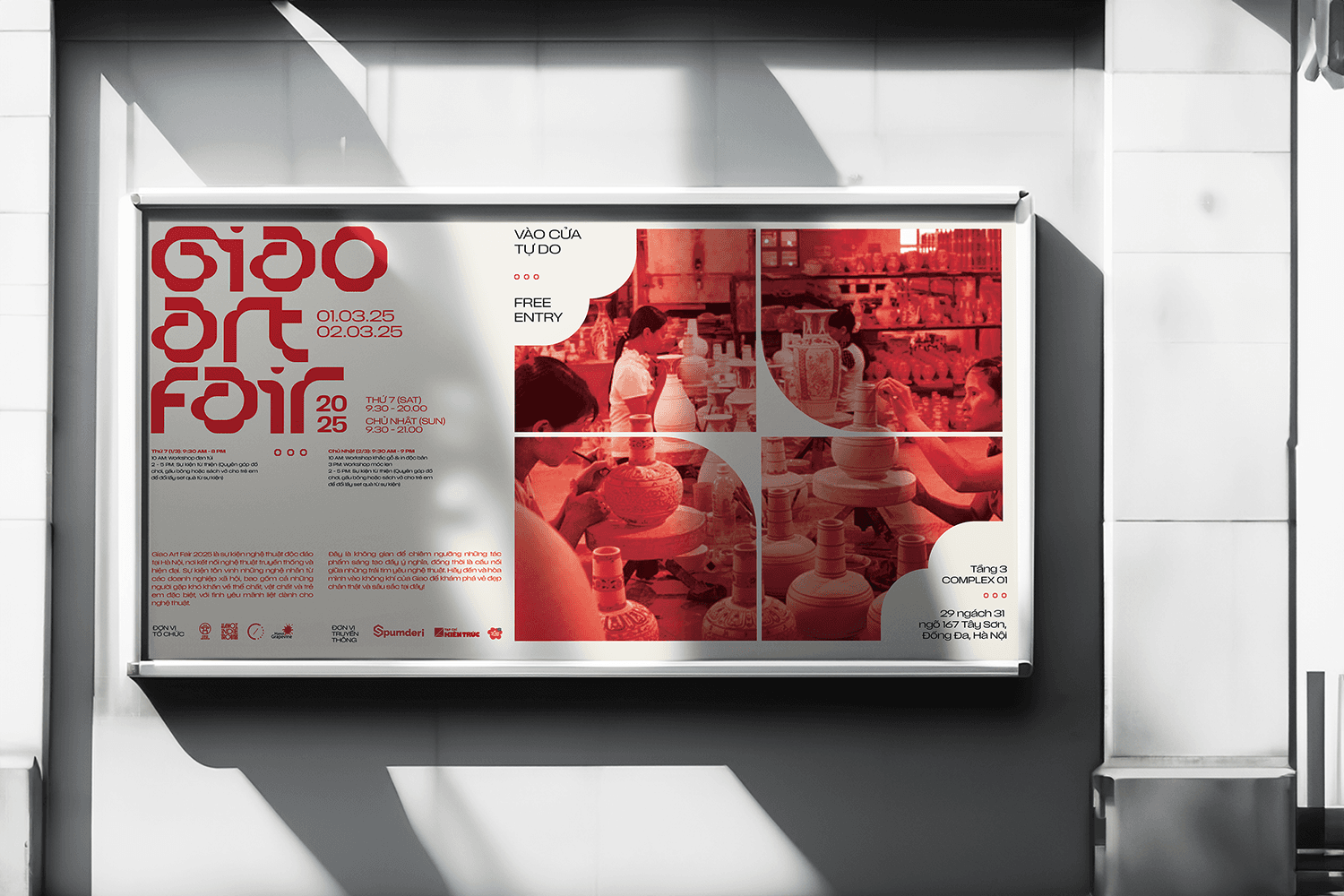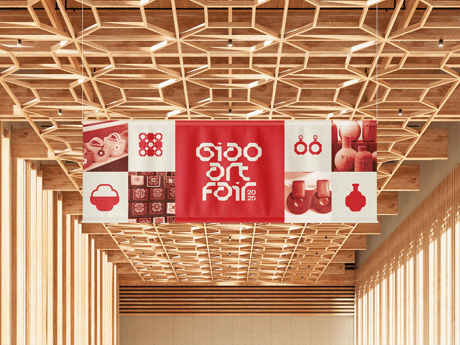 The identity and key visual for GIAO center around a four-petal flower logo, symbolizing connection, growth, and harmony. The warm beige and red color palette creates a welcoming, heartfelt atmosphere, while real photographs are integrated to evoke authenticity and closeness - reflecting the fair’s mission to connect people through art with real social impact.